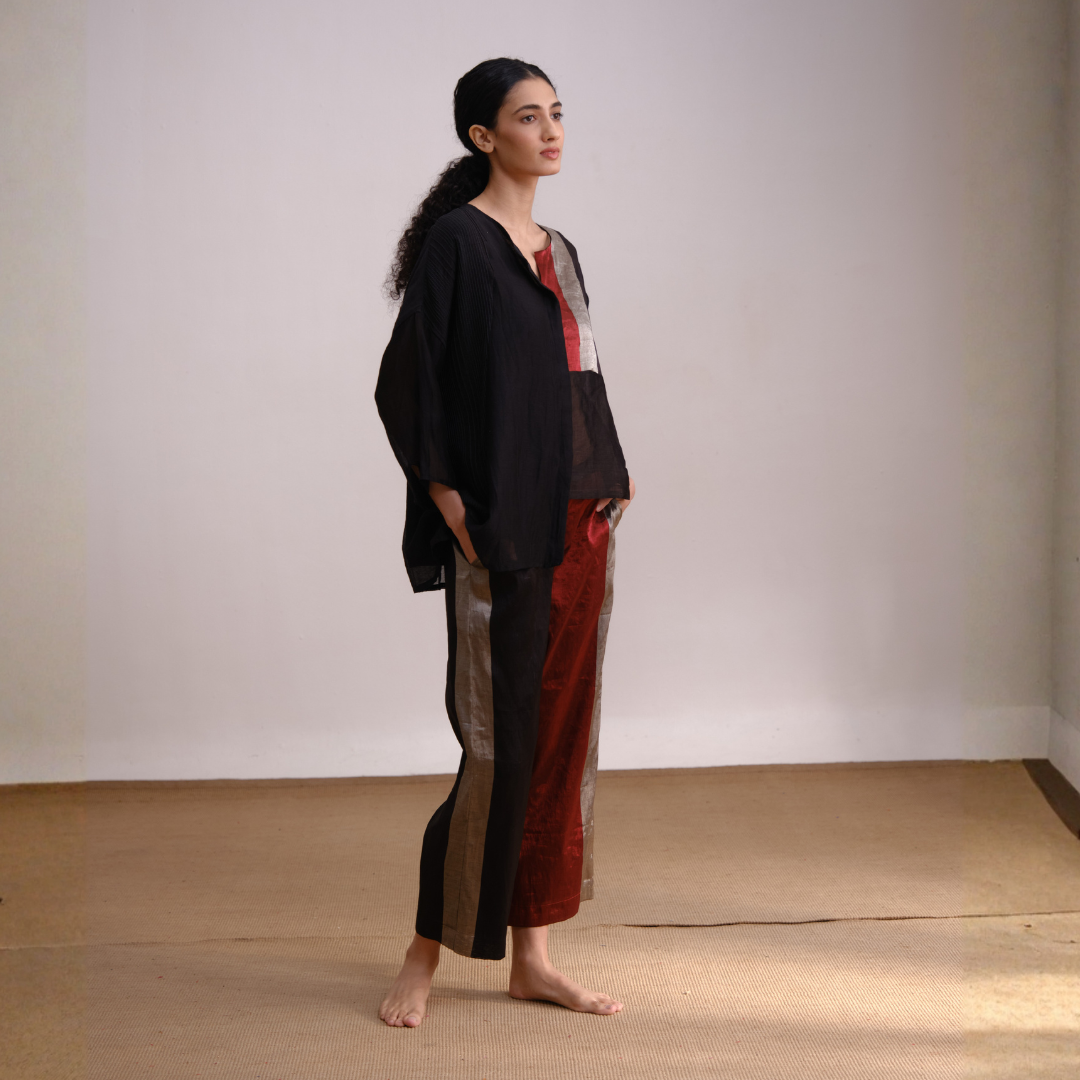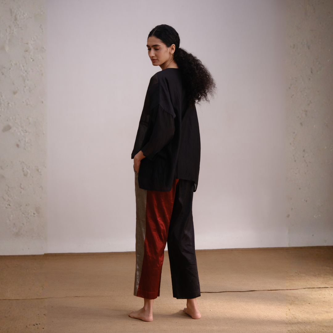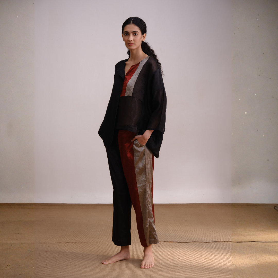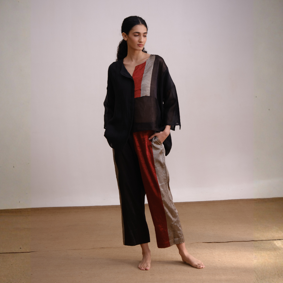 Curious Set features a fluid, relaxed silhouette highlighted by bold color-blocked panels for an artistic, modern edge. Crafted in lightweight fabric, it blends comfort with contemporary style for an effortlessly standout look.