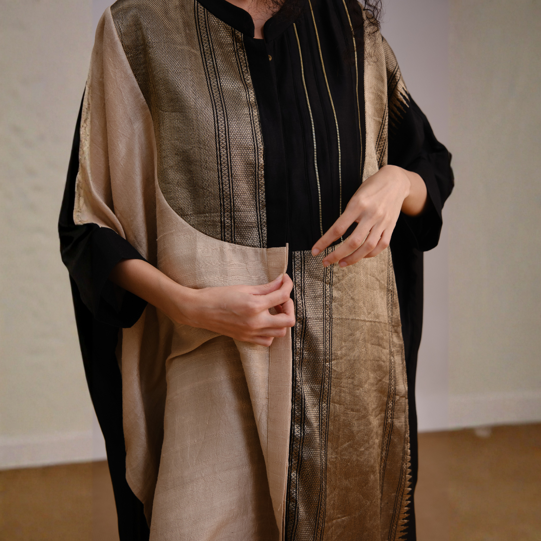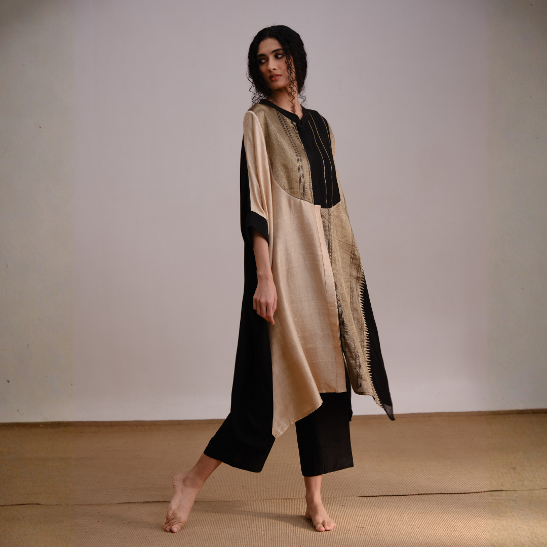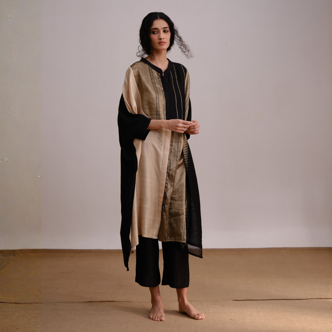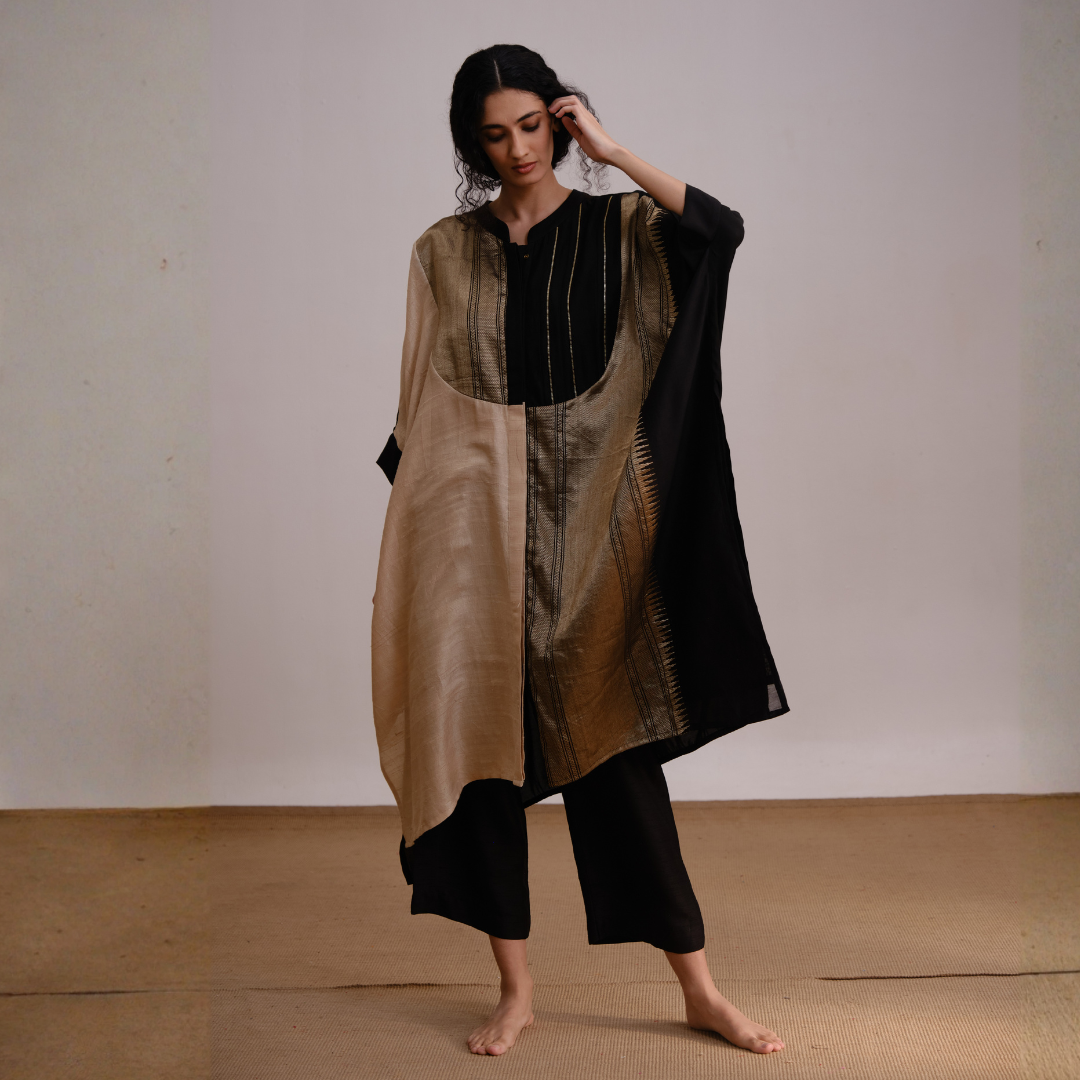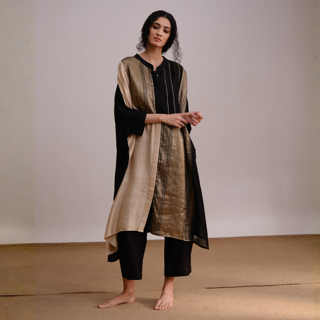 Mystical Set features an elegant fusion of black and gold tones, creating a timeless silhouette that exudes grace and sophistication. Its flowing design and rich fabric make it perfect for both contemporary and traditional occasions.