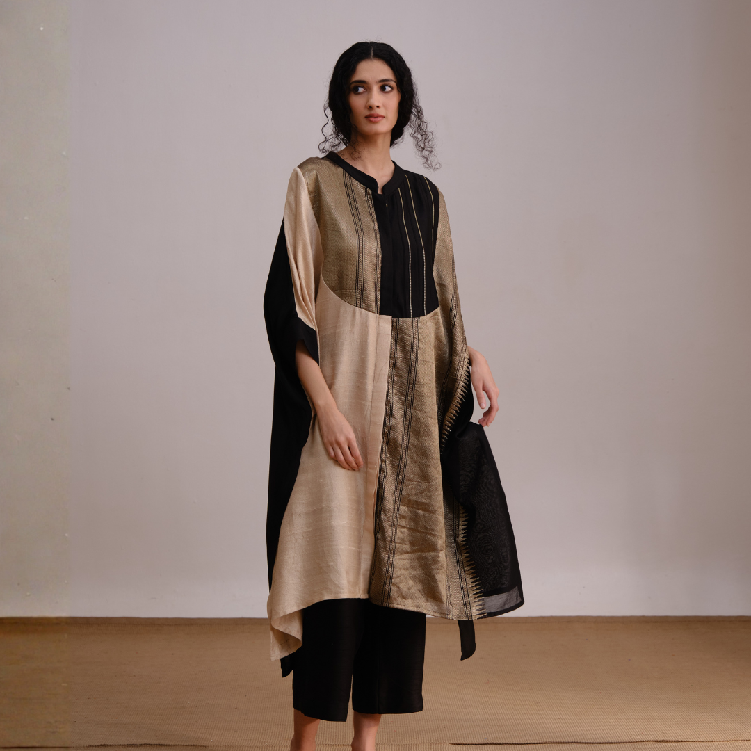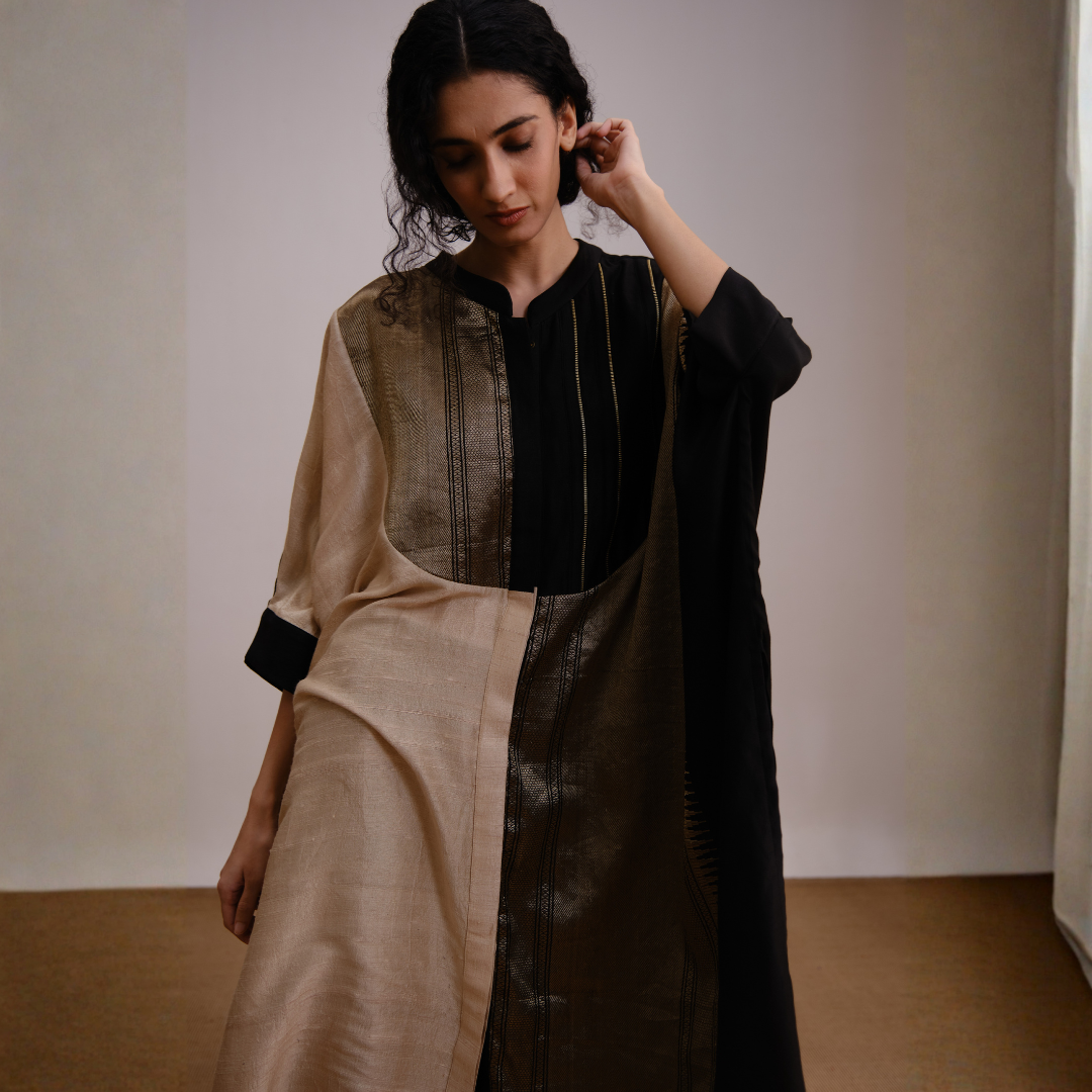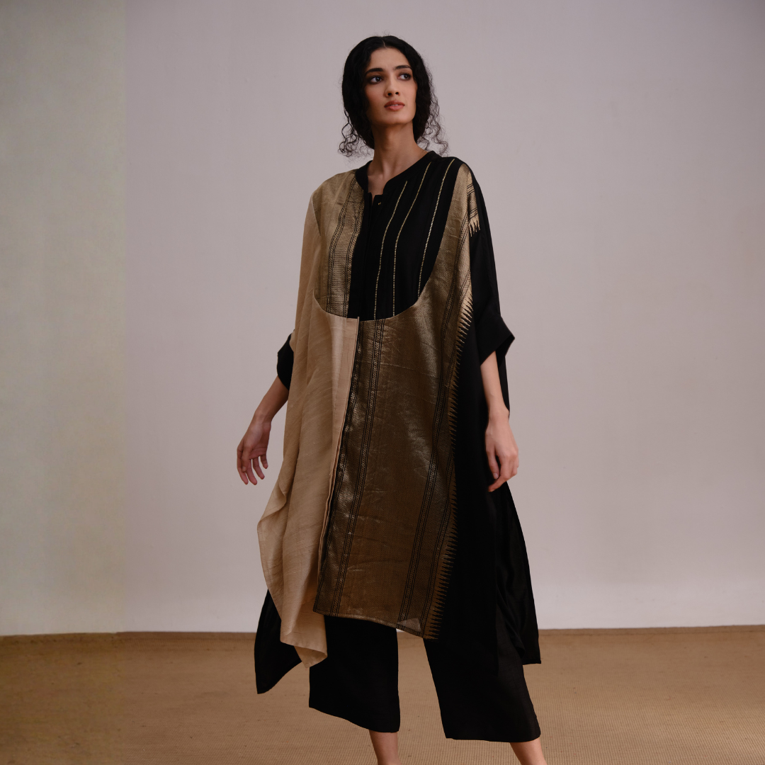 The Mystical Top showcases an elegant blend of black and gold tones, designed to create a refined and graceful silhouette. Crafted from rich, flowing fabric, it drapes beautifully, adding a touch of sophistication that works effortlessly for both contemporary and traditional settings.