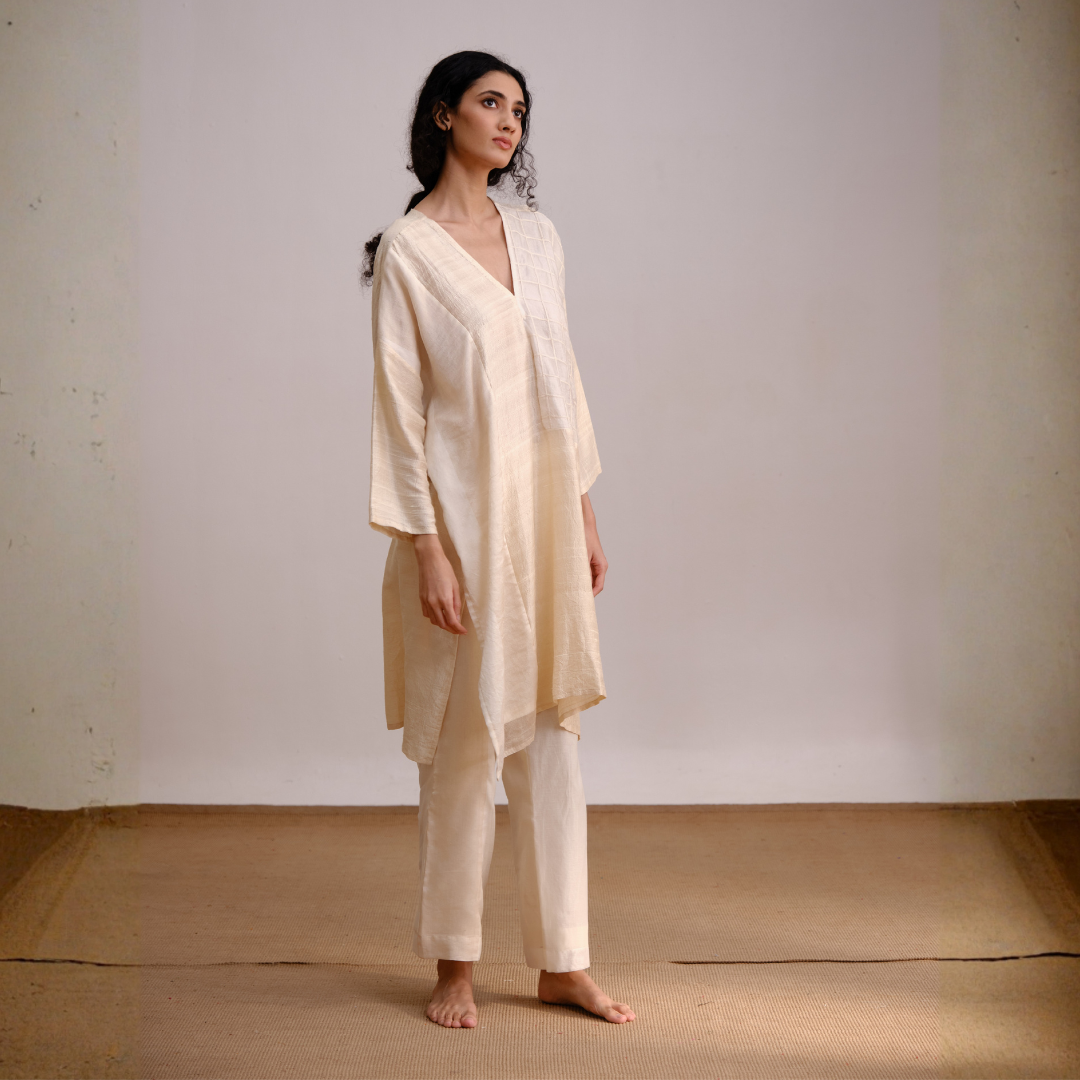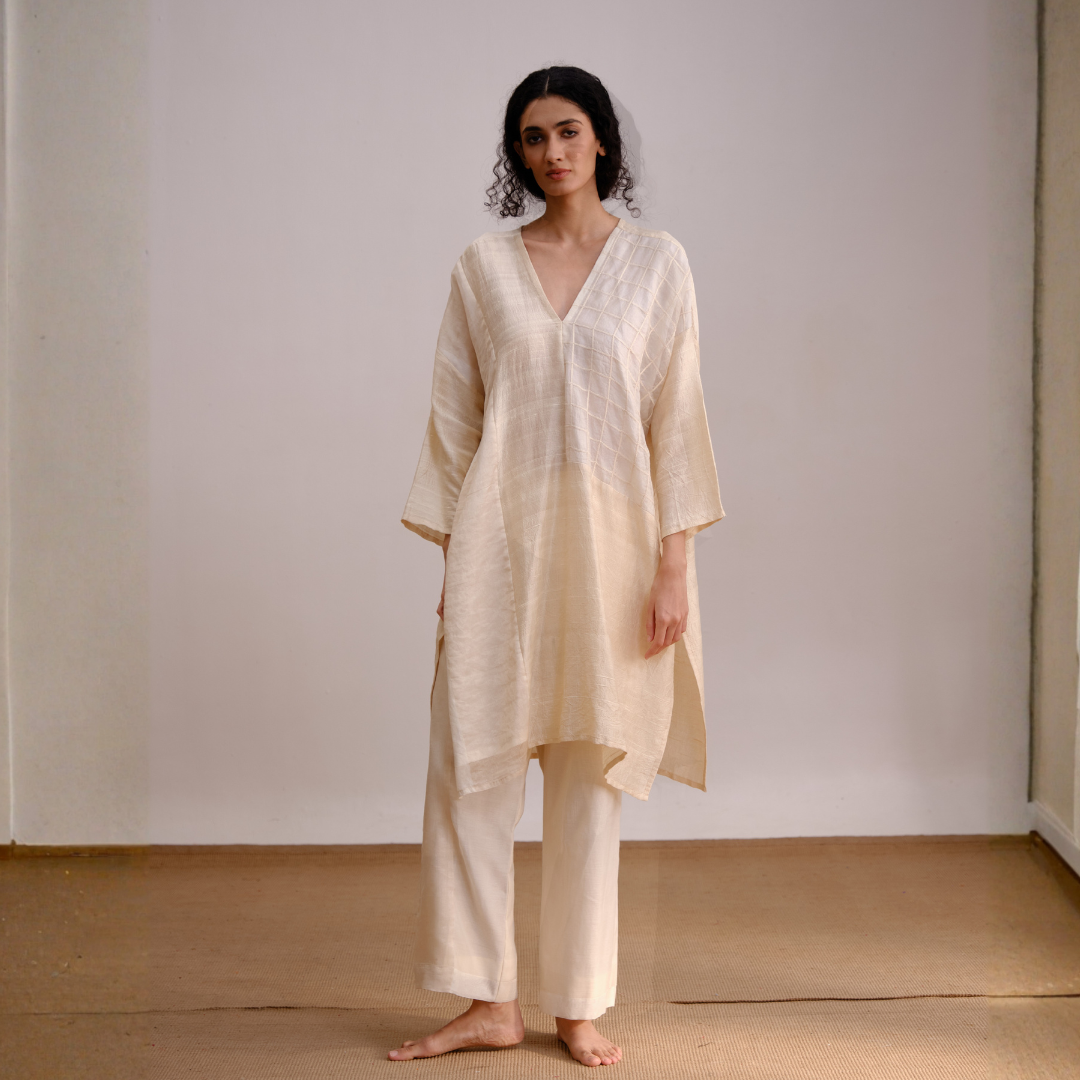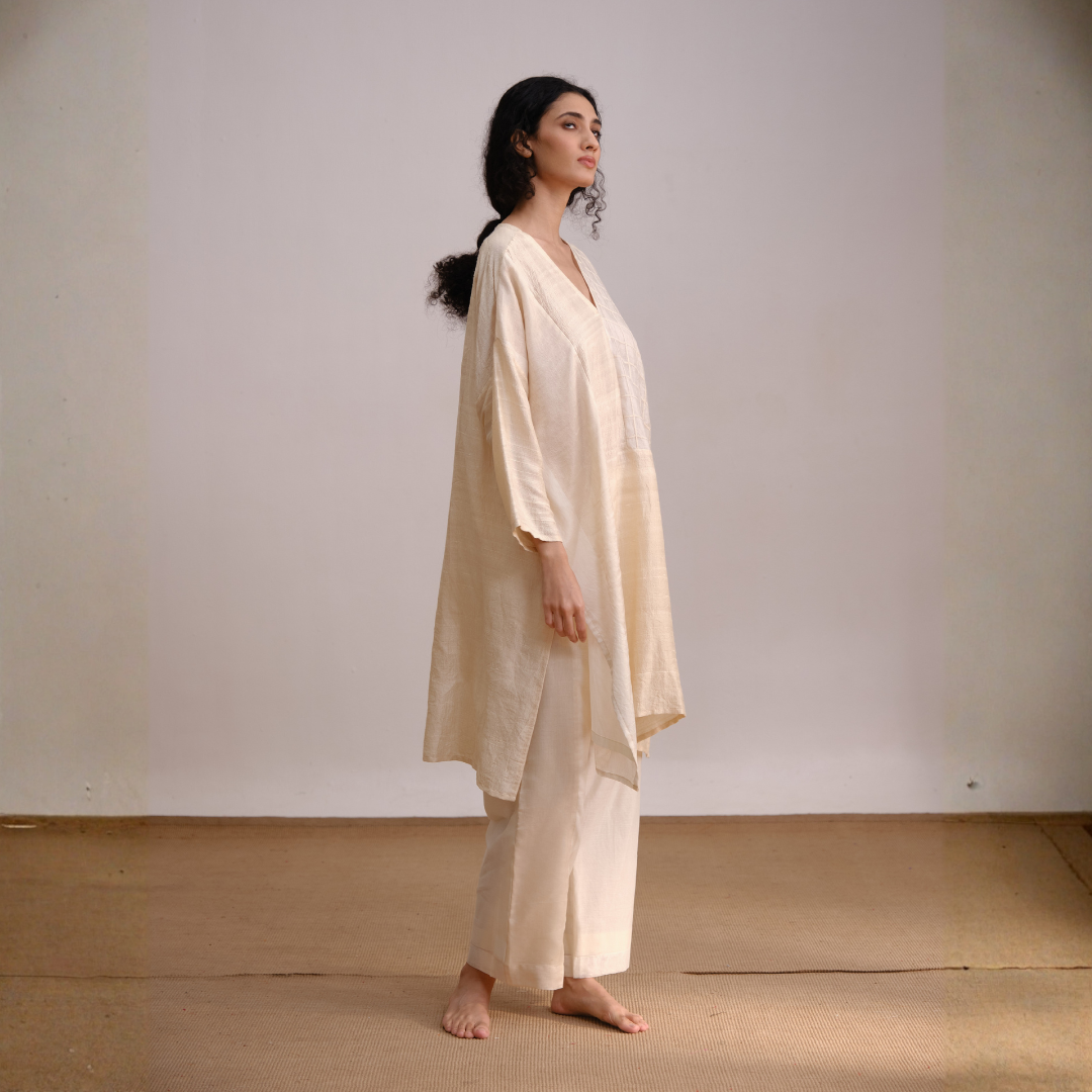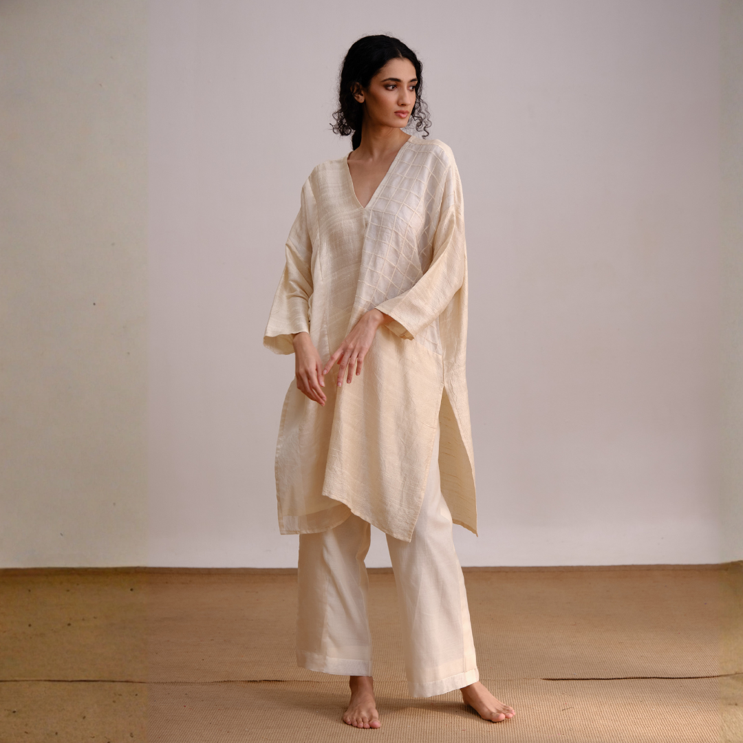 Dry clean only. Store the garments in a muslin cloth, away from sunlight in a dry environment. Air the textile once every few months.