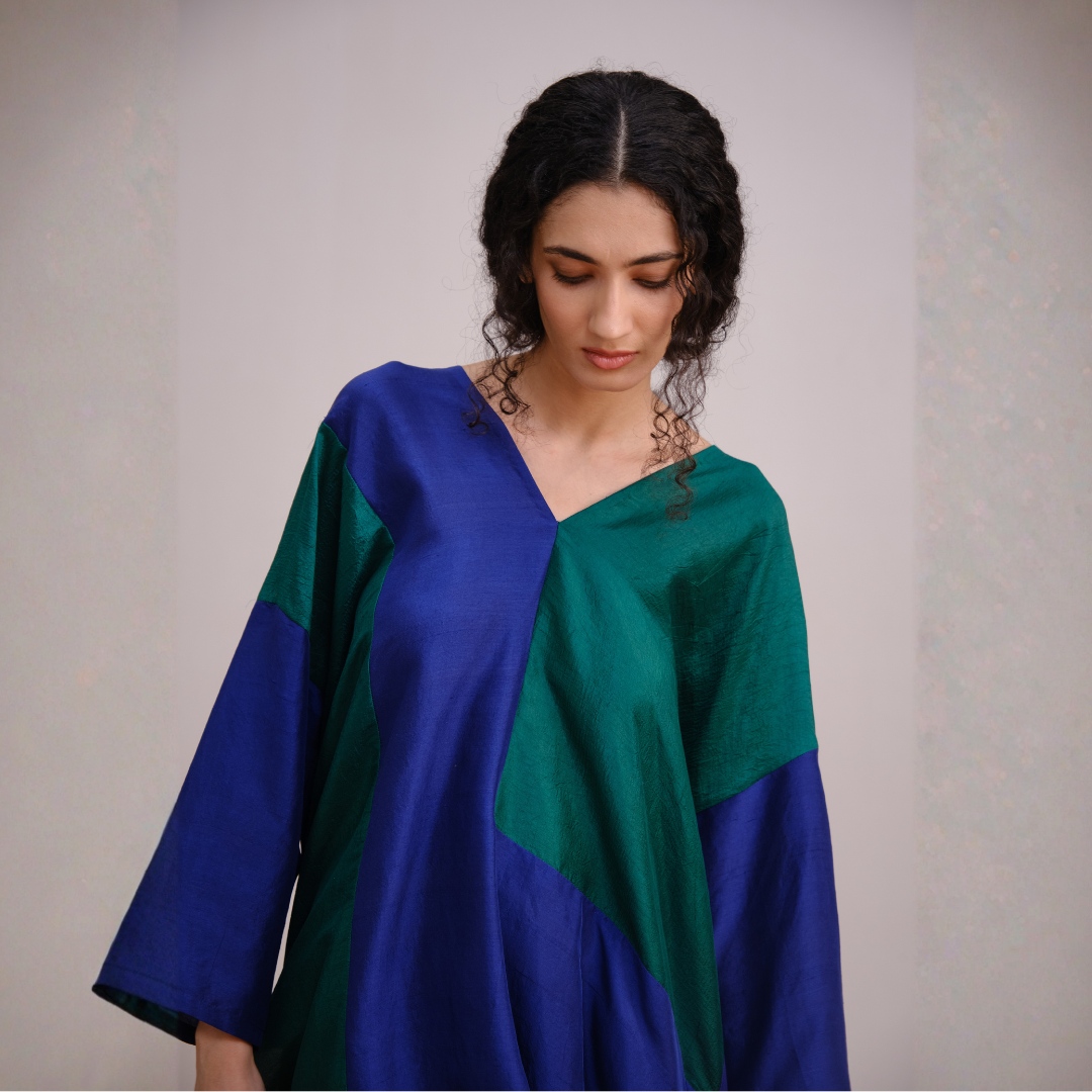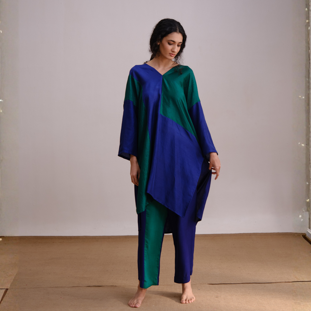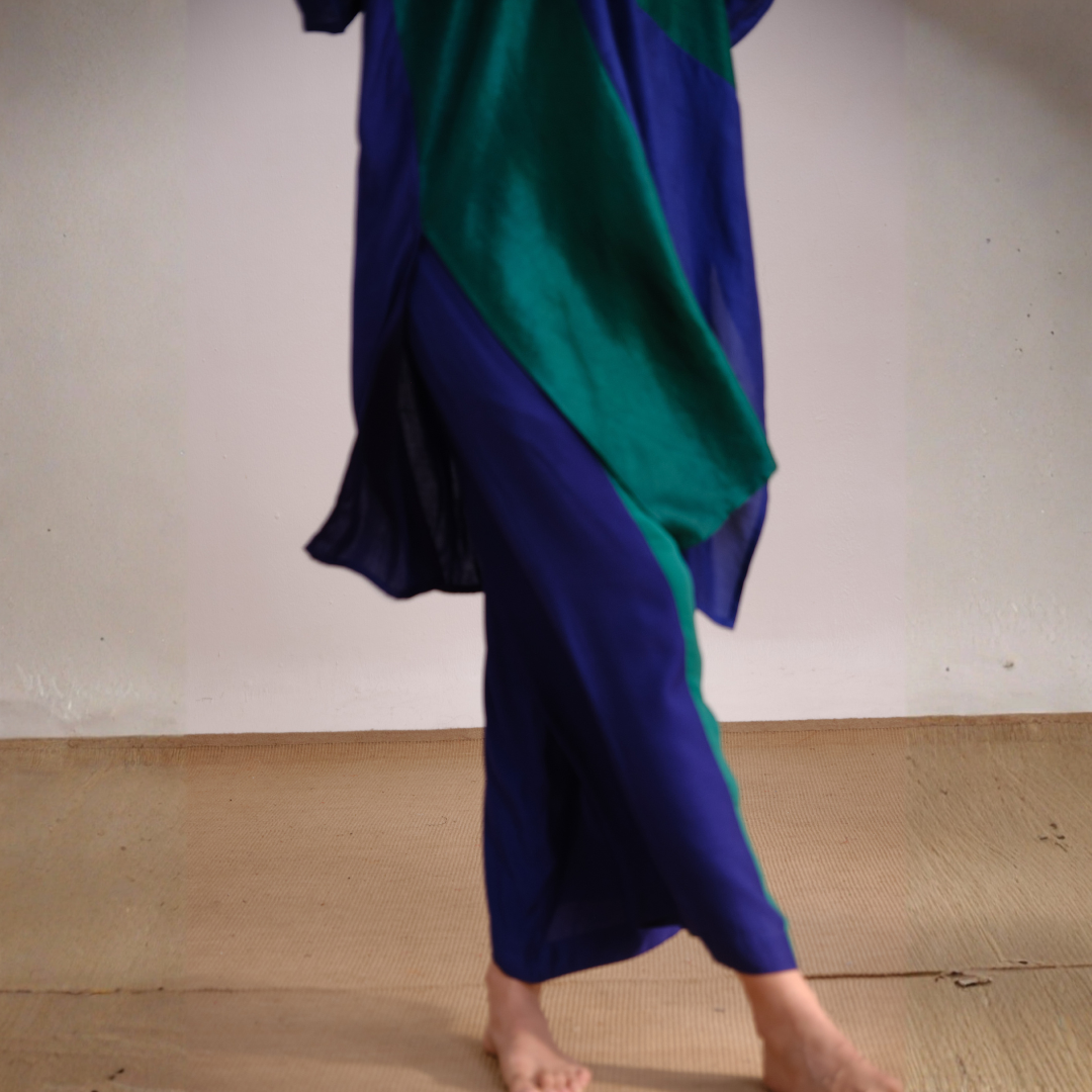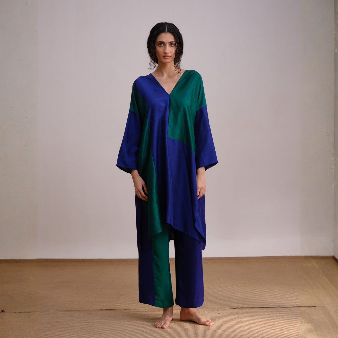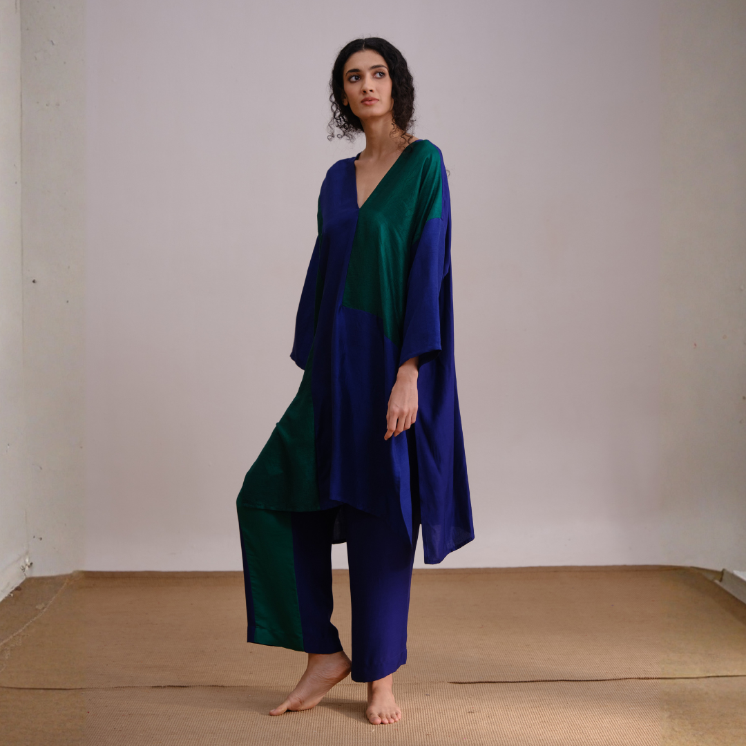Coffee Set is a loose, color-blocked outfit , featuring a flowy V-neck top and relaxed pants.