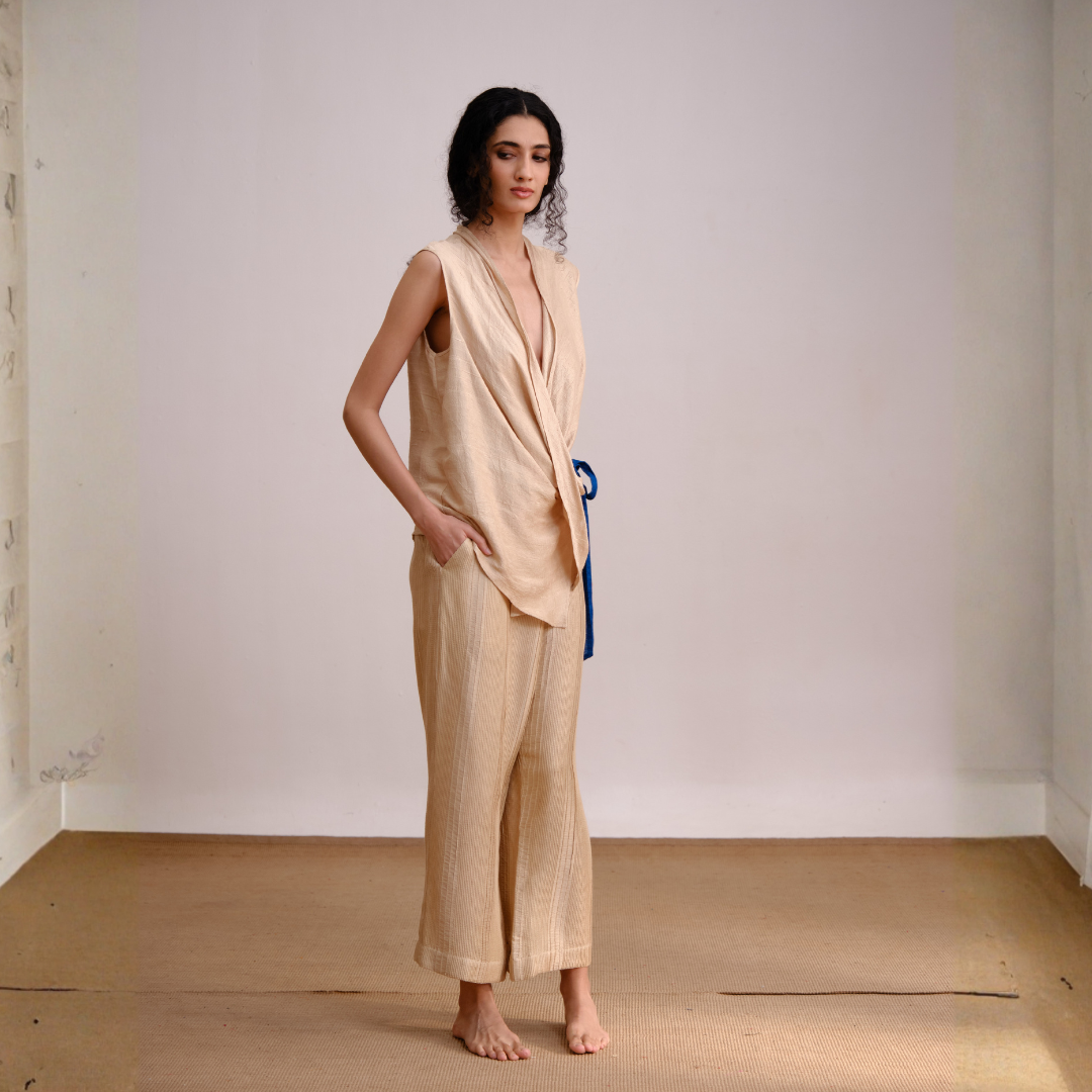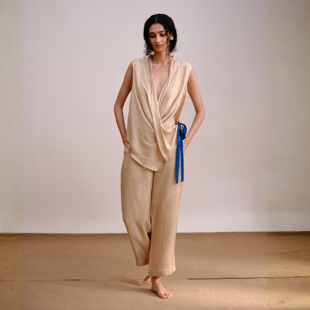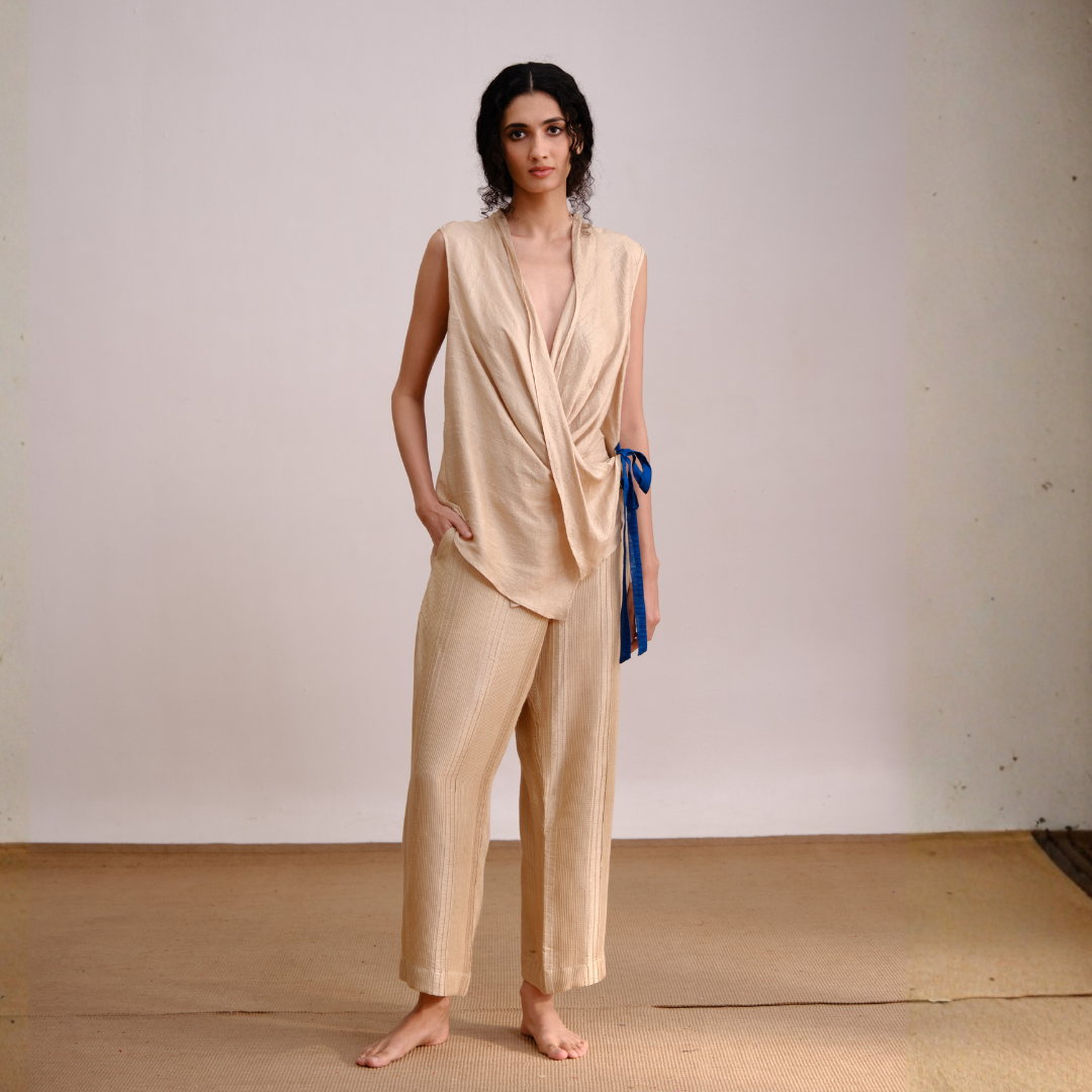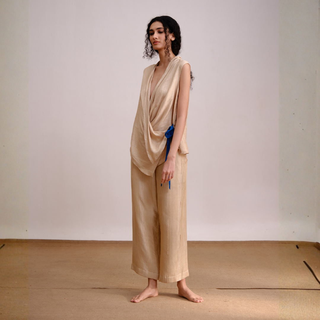 Otomo Set is a draped, sleeveless top paired with loose, textured pants.