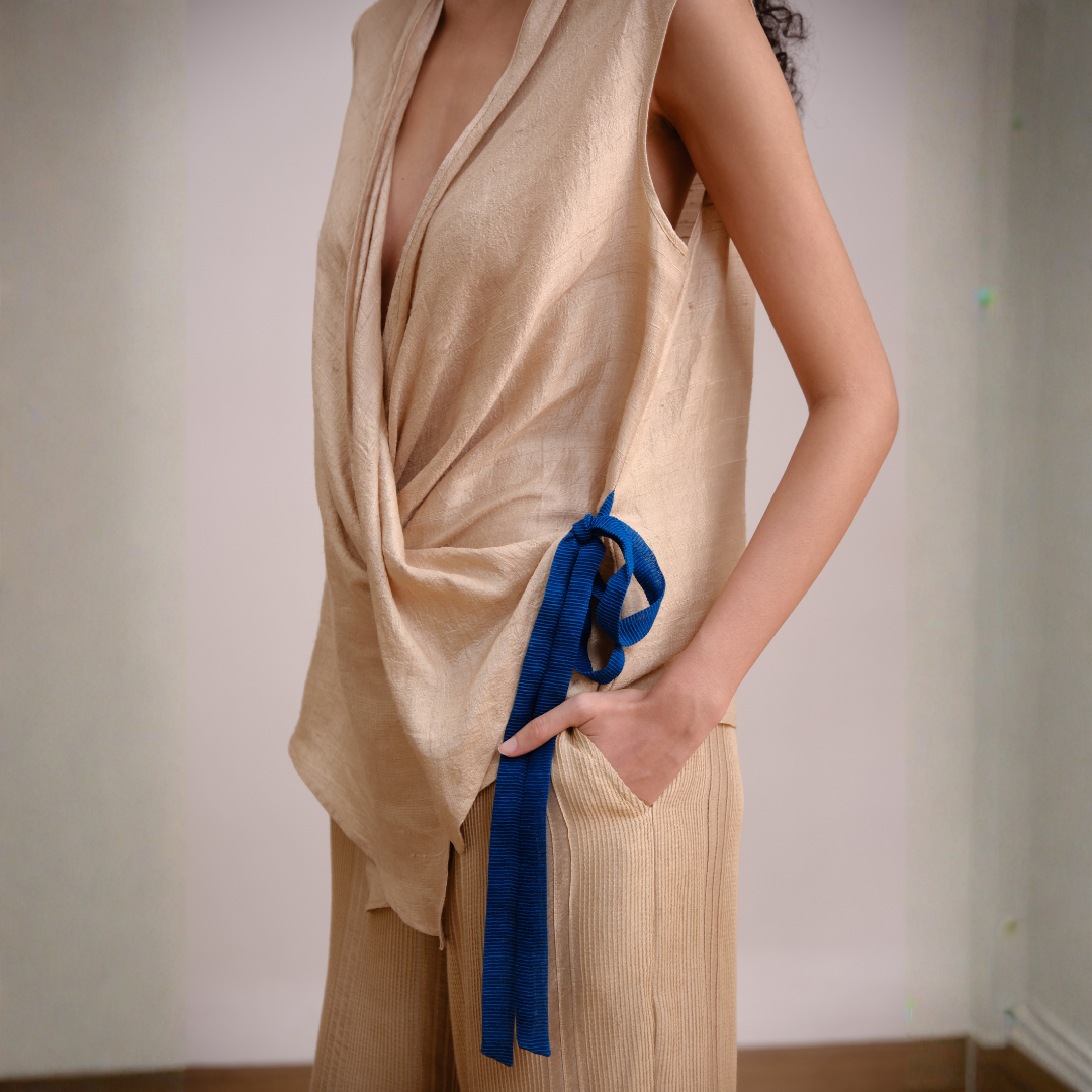 A pop of color comes from a blue tie detail at the waist, adding contrast to the minimal, earthy look