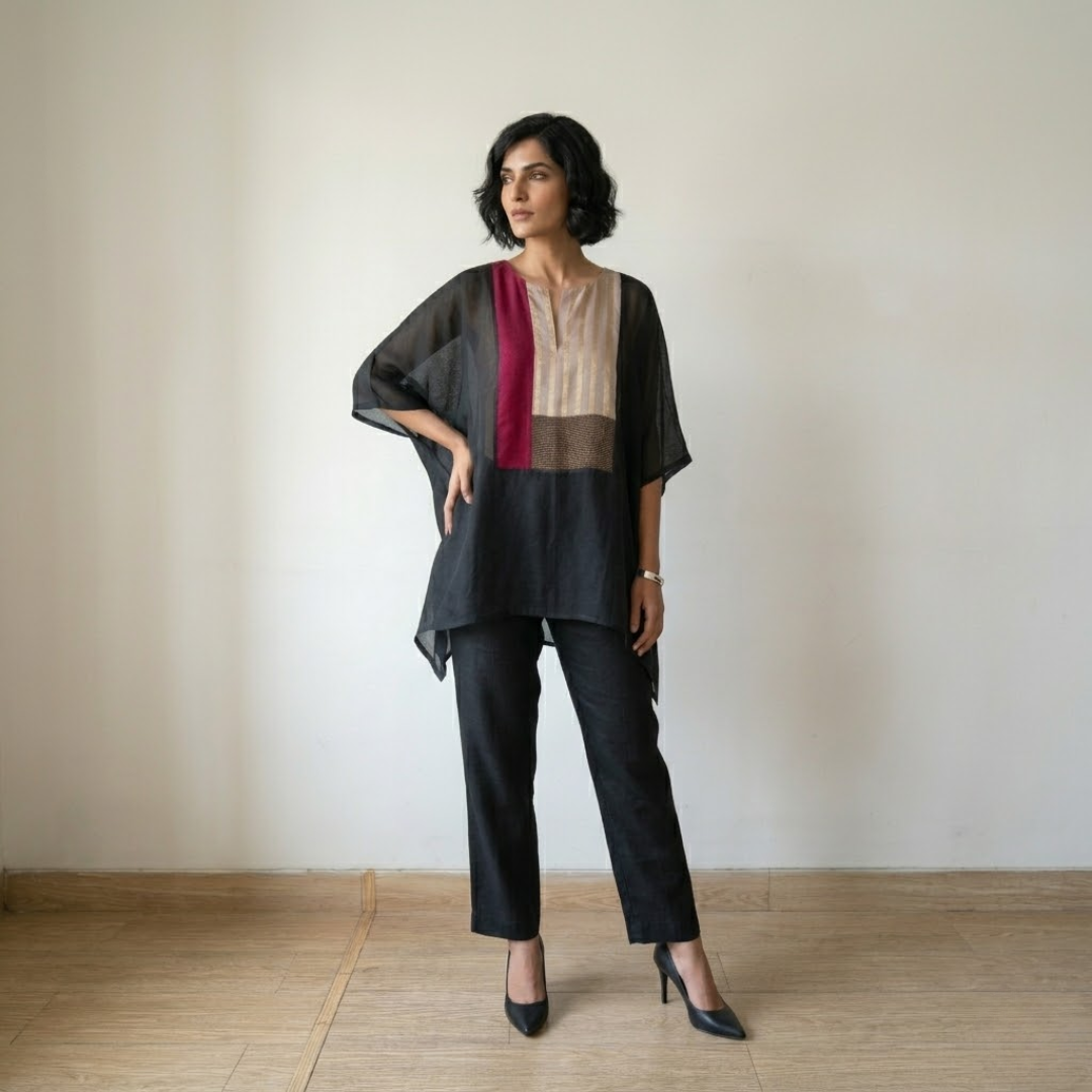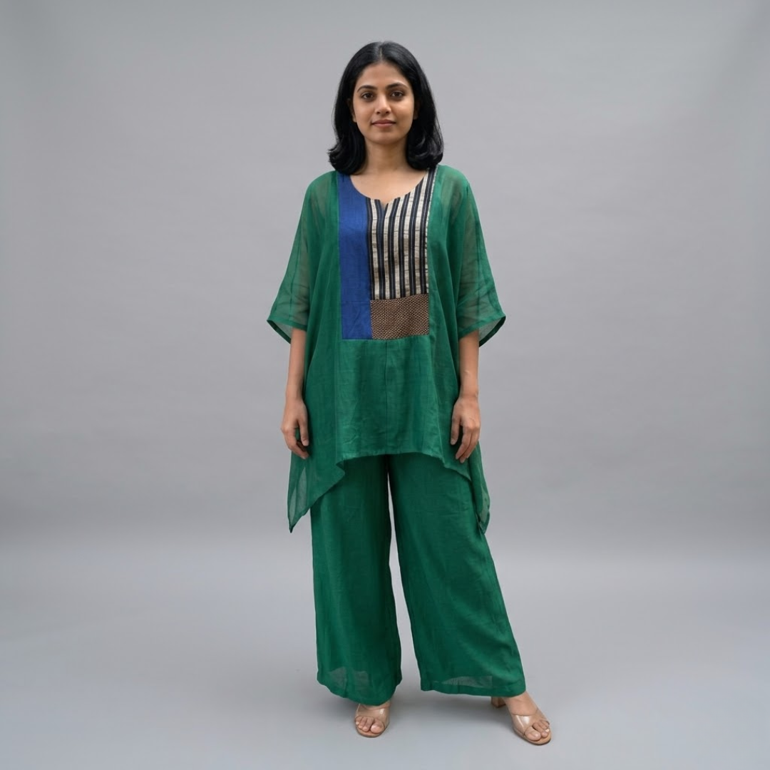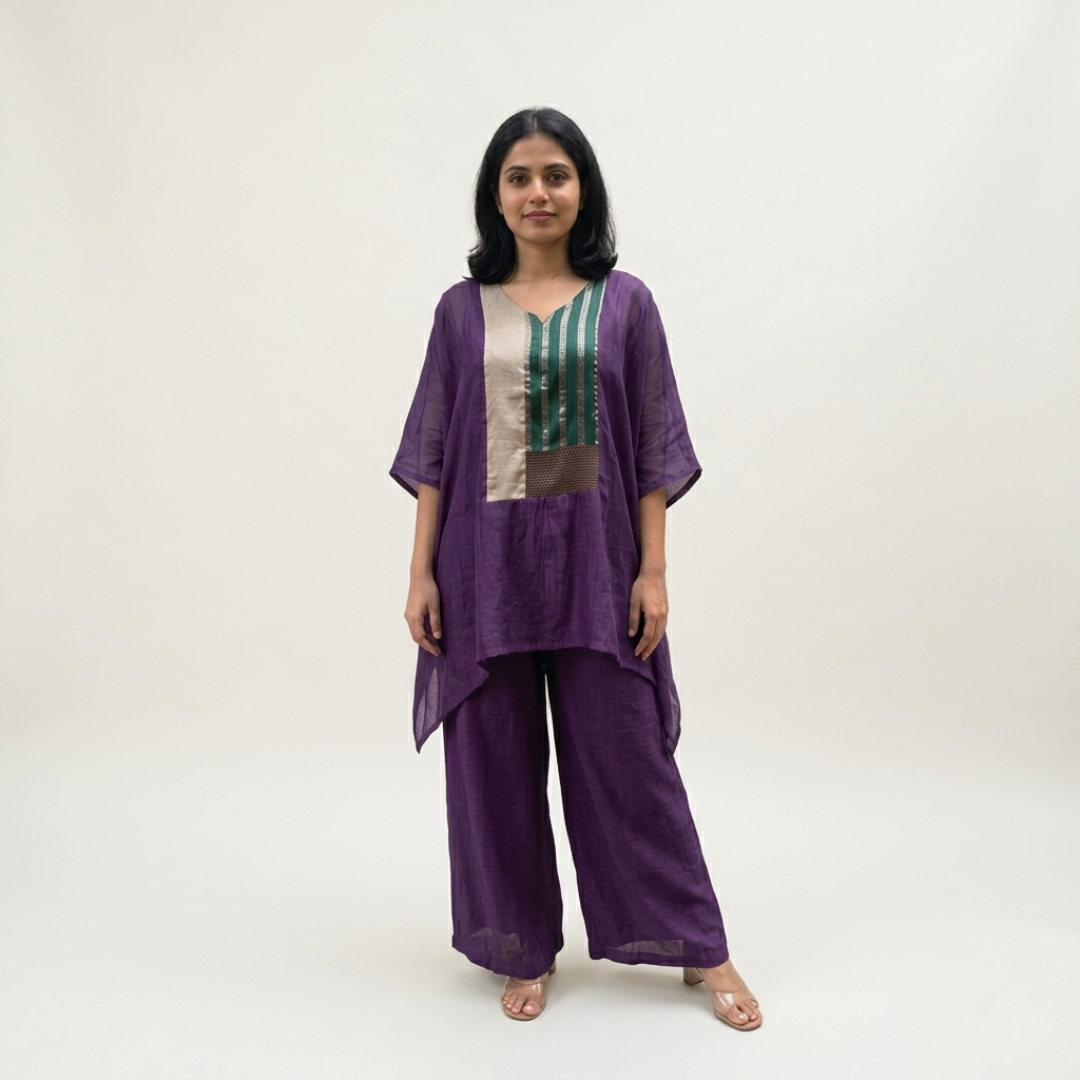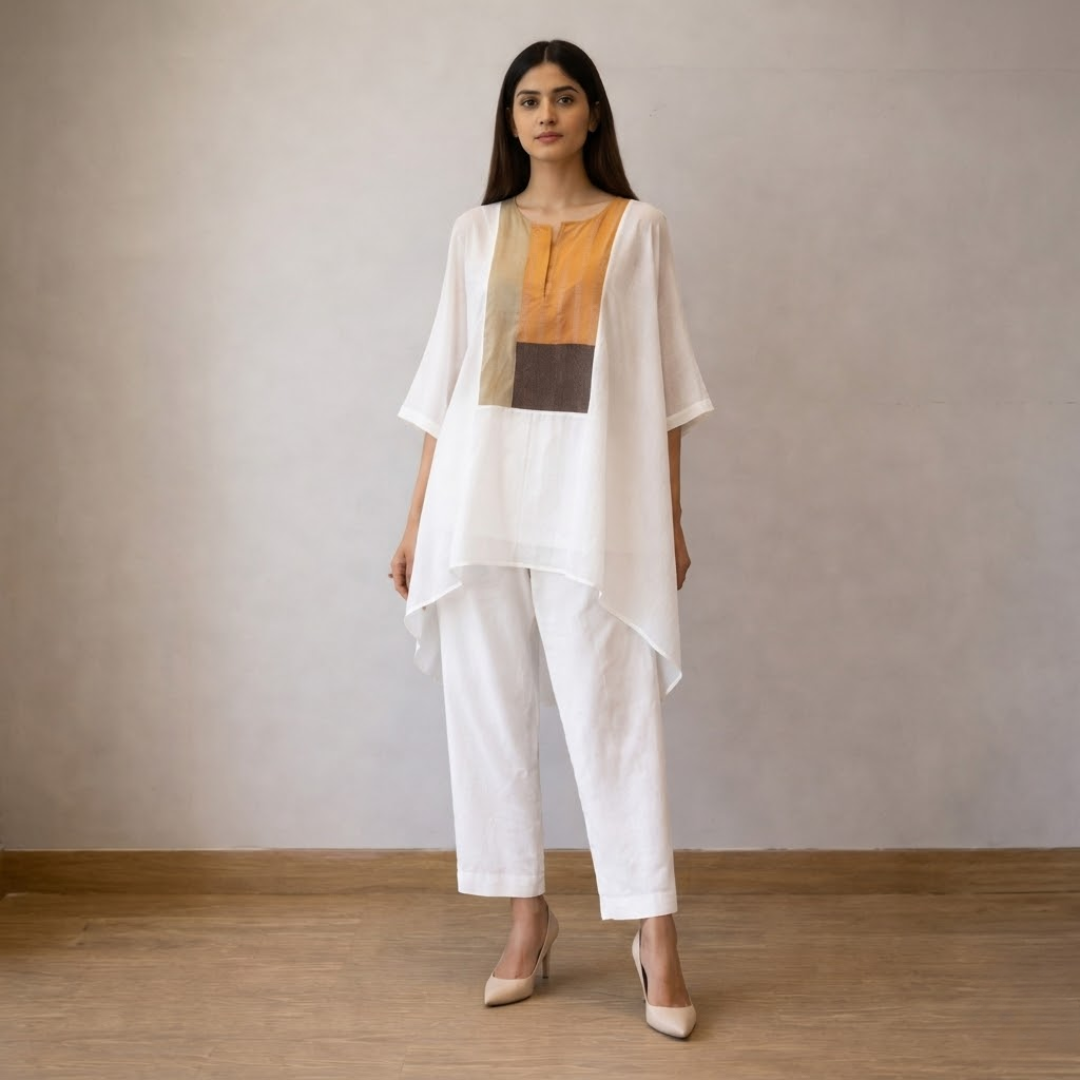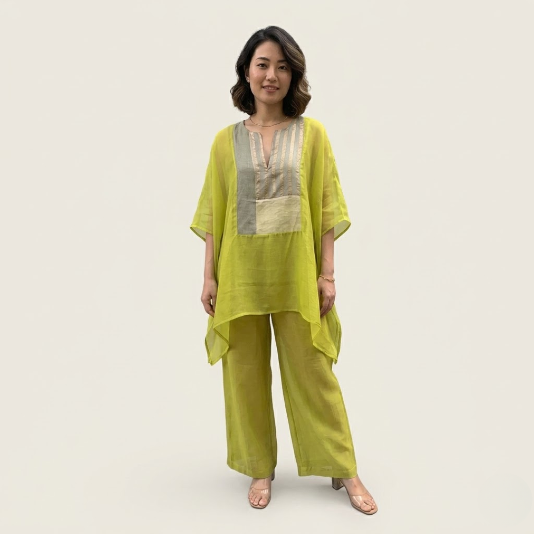 Crafted in lightweight Chanderi, this set offers an elegant balance of comfort and refinement. The flowy overlay top features a subtle color-block panel that adds a contemporary touch to the silhouette. It is paired with tailored pants designed with a clean side pleat for a structured finish. Perfect for effortless, everyday sophistication.