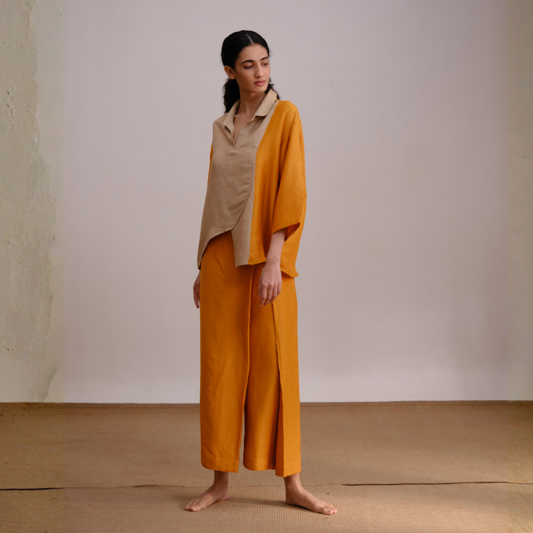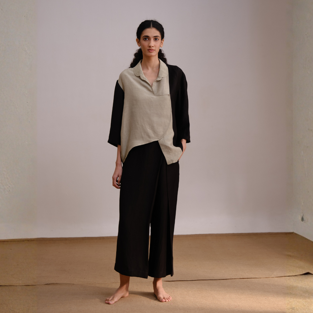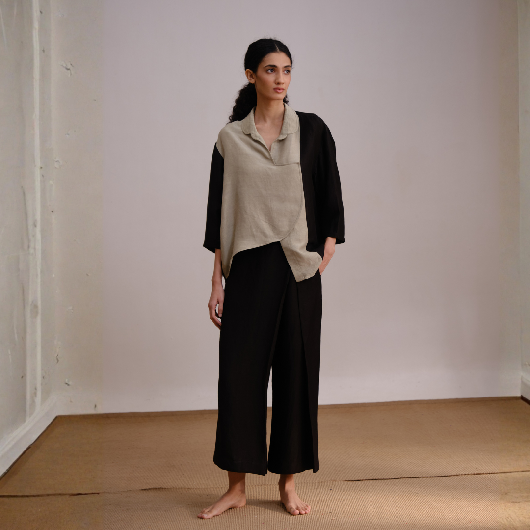 RipTide Set is a relaxed, two-tone outfit featuring a asymmetrical top paired with wide-legged trousers. The look is minimalist, comfortable, and crafted from lightweight fabric suitable for casual or artistic settings.