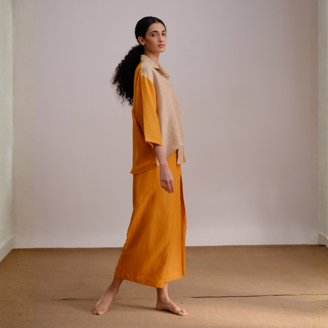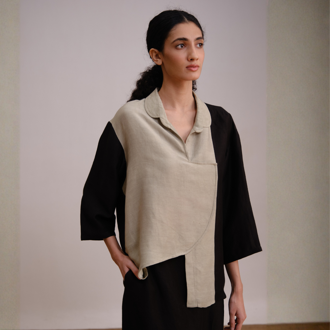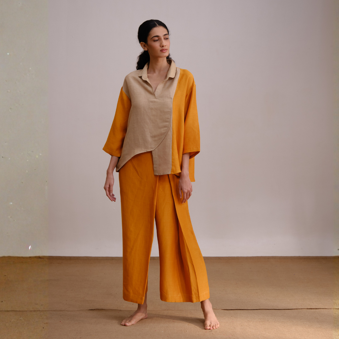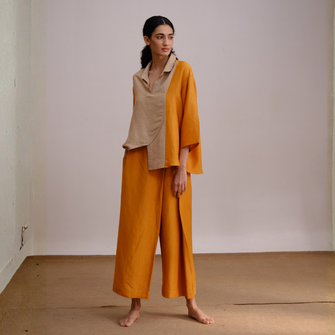 RipTide Set is a relaxed, two-tone outfit featuring a asymmetrical top paired with wide-legged trousers. The look is minimalist, comfortable, and crafted from lightweight fabric suitable for casual or artistic settings.