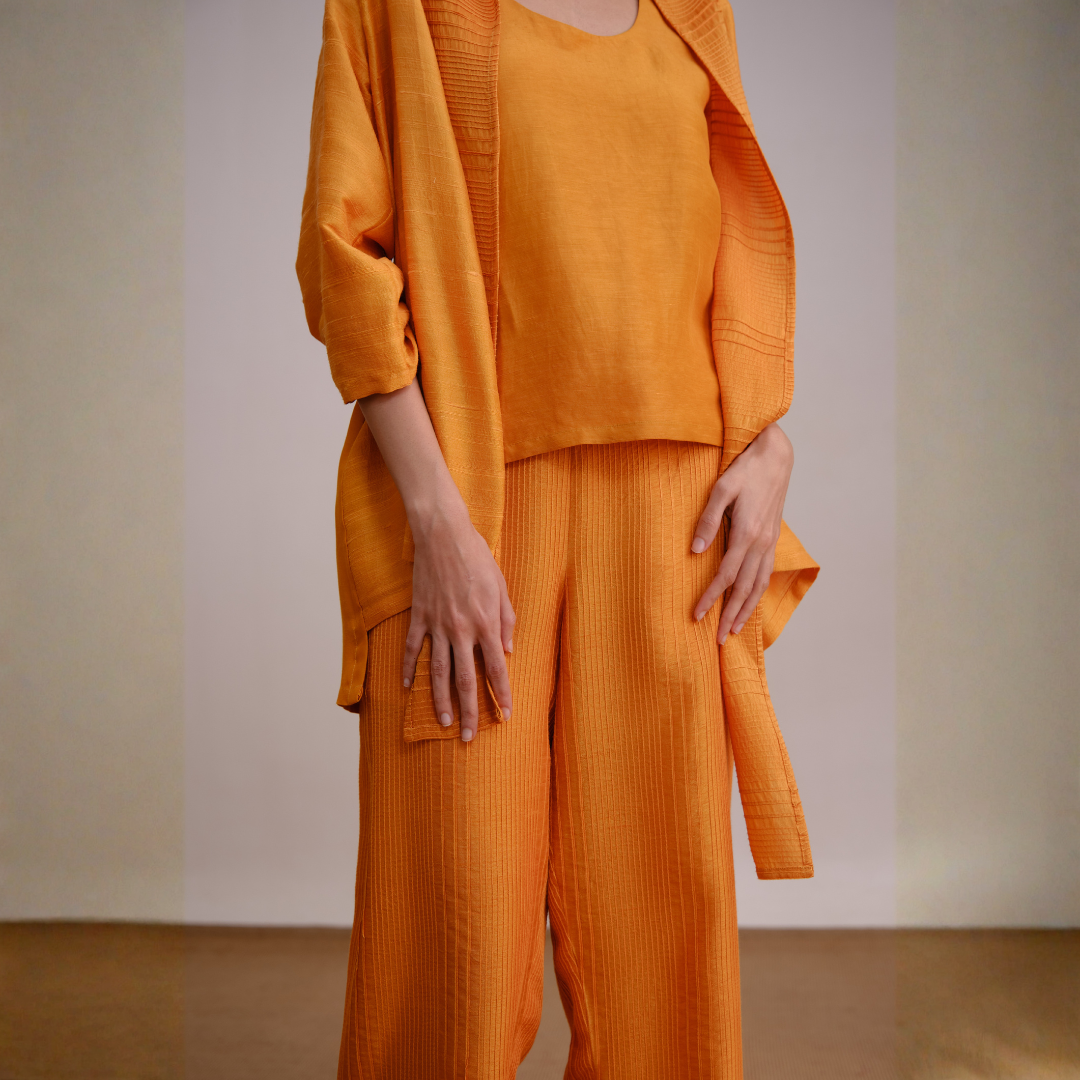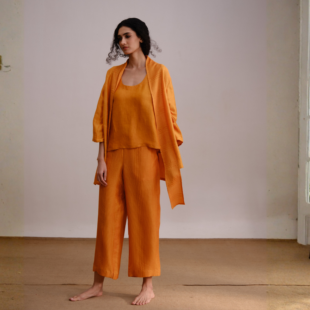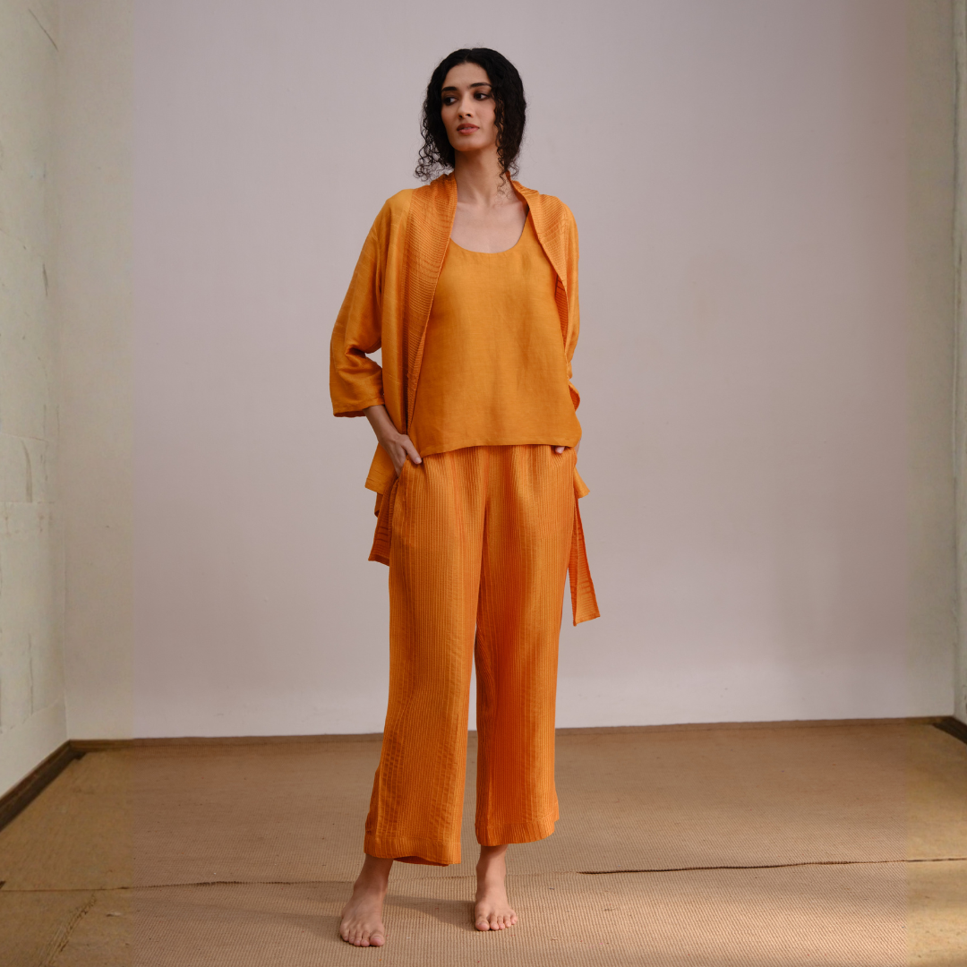 Texas Set is a relaxed, lounge set in a warm, rich orange tone, featuring a loose tank top, wide-leg pants, and a matching open-front layer. Its soft, flowy fabric and barefoot styling give it an effortless, cozy, and minimalist feel.